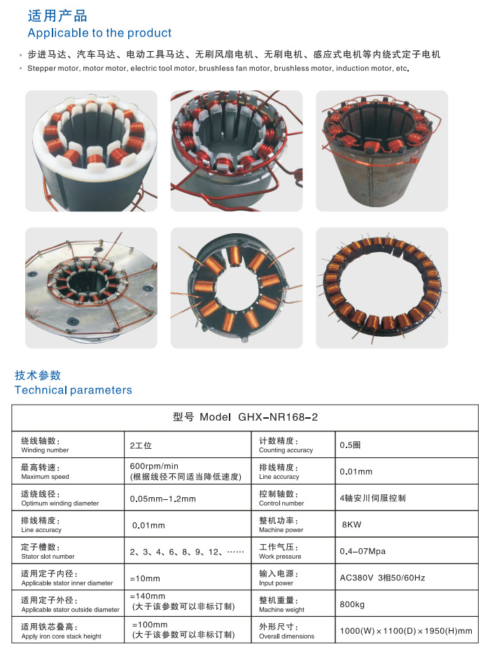 设备主要驱动系统采用日本安川伺服,控制系统,可以通过电脑程序实现全自动缠脚,过线、绕线、跨槽、抽头、夹、剪线,定子360°任意正反旋转位置,实现各种不同产品精密排线方式产品编程简单方便,搭配安川专用软件,可无限存储程序,通过简单培